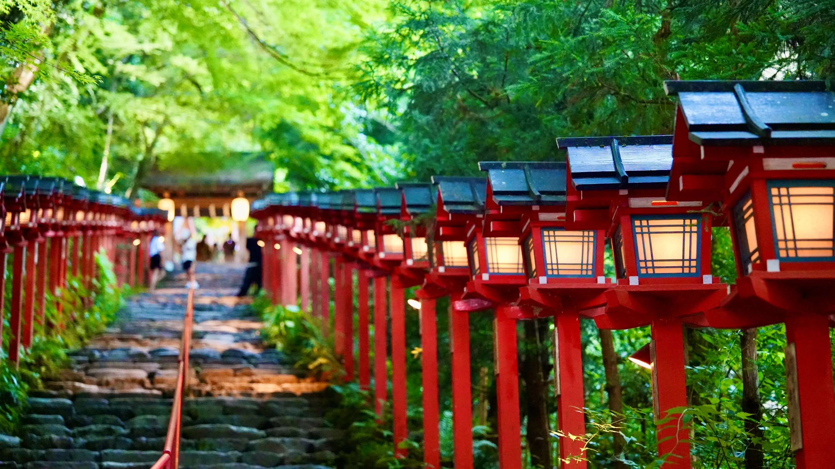 As evening arrives, Kifune Shrine illuminates with thousands of lanterns along its vermilion path, creating a magical setting.