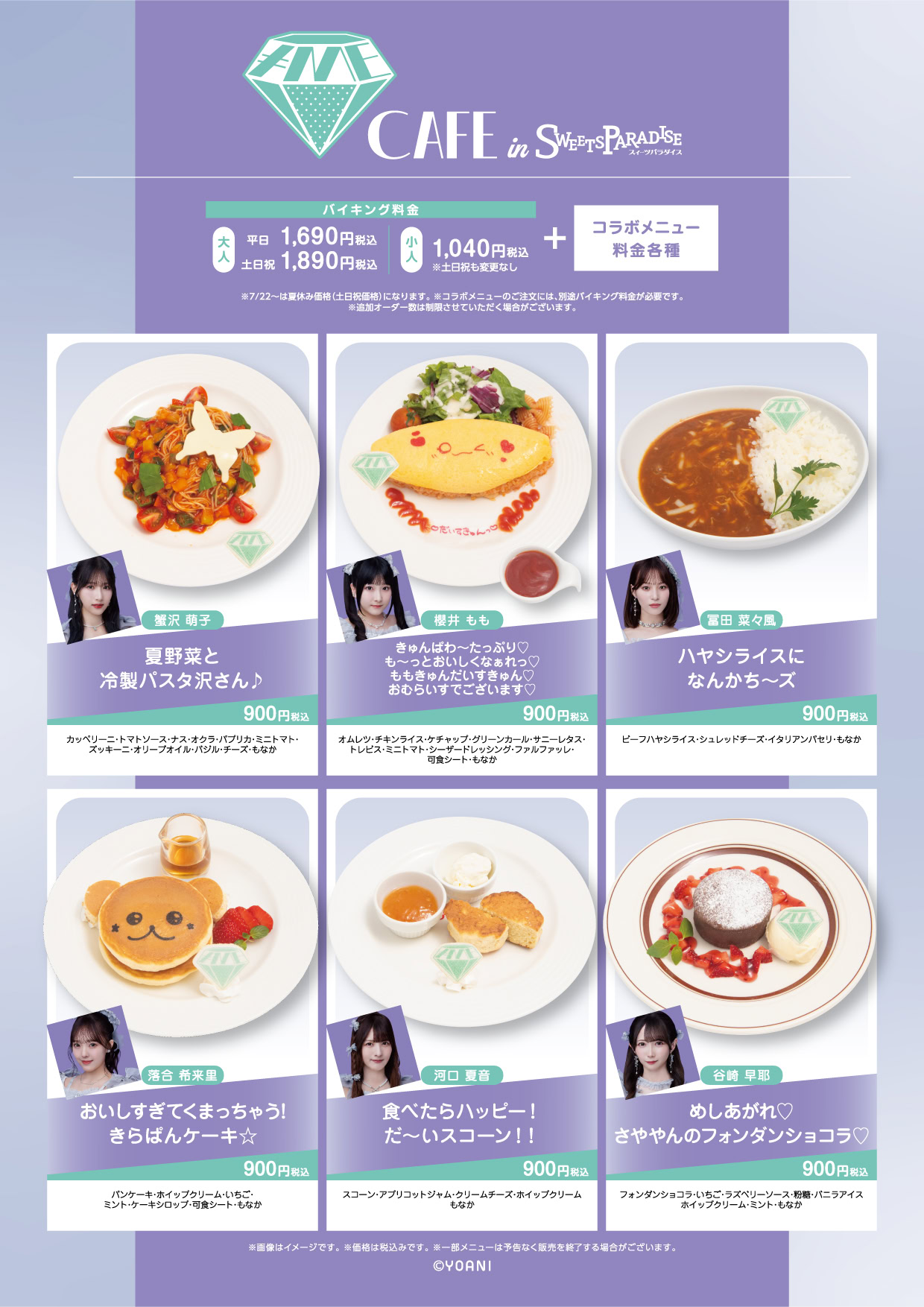 - To use the collaboration menu, you will need to order a standard buffet charged as follows: 1,690 yen for adults on weekdays, 1,890 yen on weekends and holidays, 1,040 yen for children.