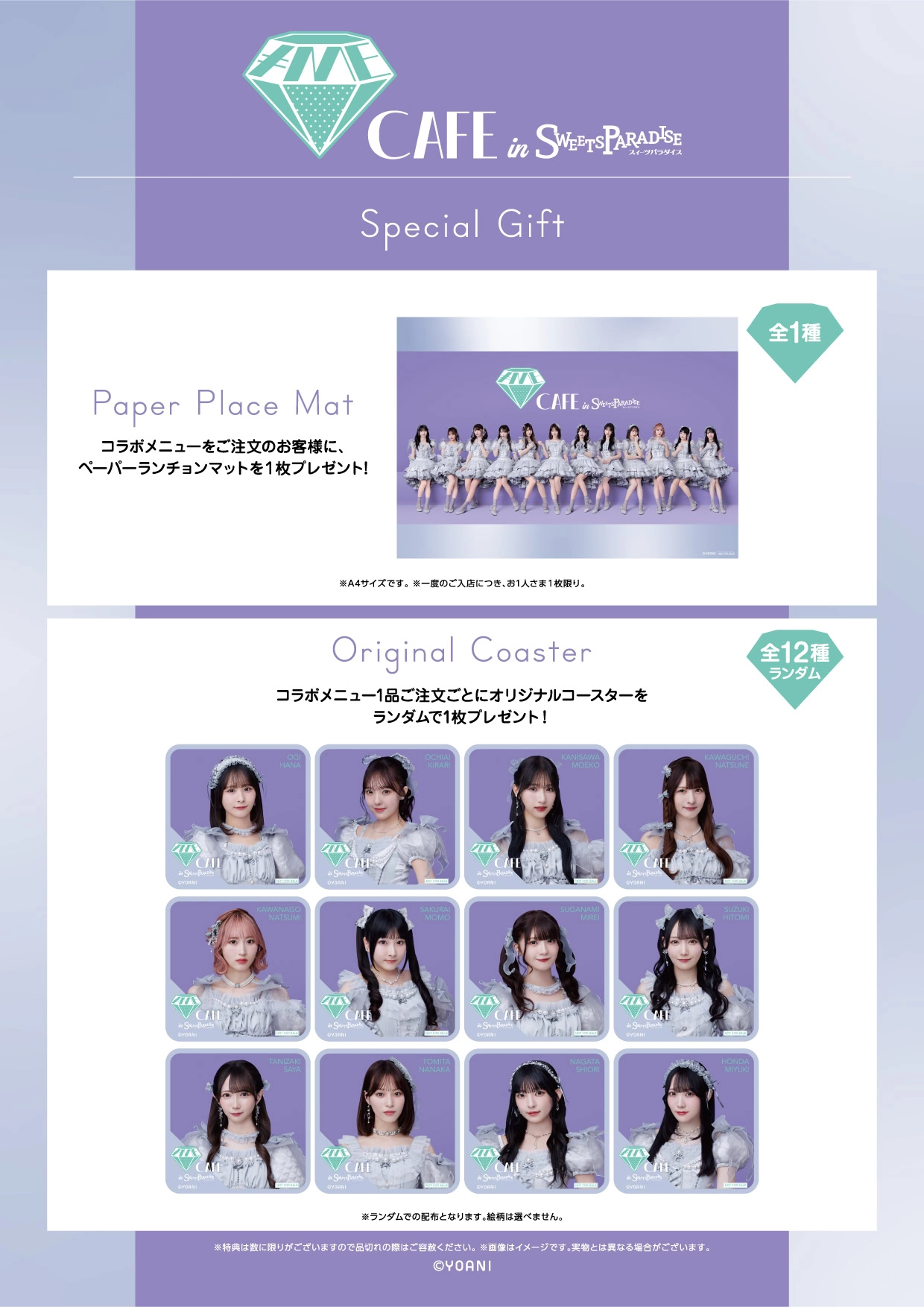 Customers who order from the collaboration menu will receive a special paper placemat and for every each menu item ordered at the café, customers will receive 1 exclusive coaster (selected at random from 12 types).
