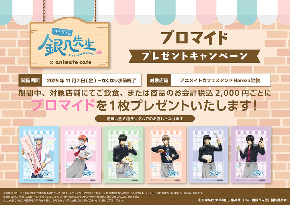 Customers who spend over 2,000 yen will receive one of 6 exclusive bromides at random.