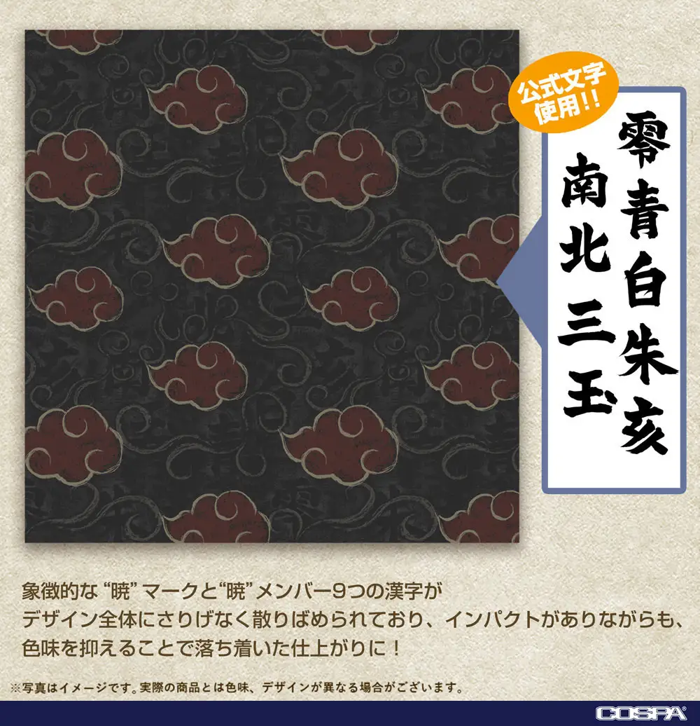 The symbolic Akatsuki mark and the nine kanji from the Akatsuki members’ rings are subtly scattered throughout the design, creating an impactful yet subdued look with its muted color palette. The ring characters used are the official inscriptions.