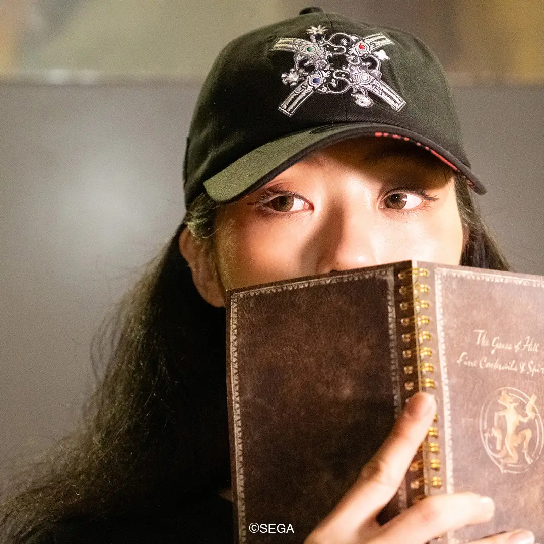 The center features a large embroidered image of Bayonetta’s signature guns, Scarborough Fair. The hidden print of the magic circle on the underside of the brim is also a notable feature.