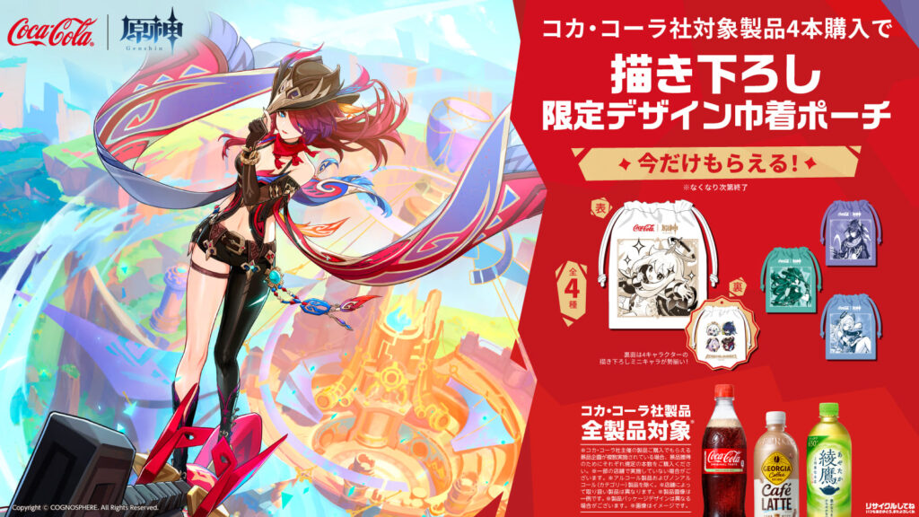 Starting Monday, April 28th, 2025, fans across Japan can participate by purchasing four Coca-Cola Company products at supermarkets and drugstores nationwide to receive one limited-edition drawstring pouch featuring newly drawn artwork of Paimon and other beloved characters from “Genshin Impact.”