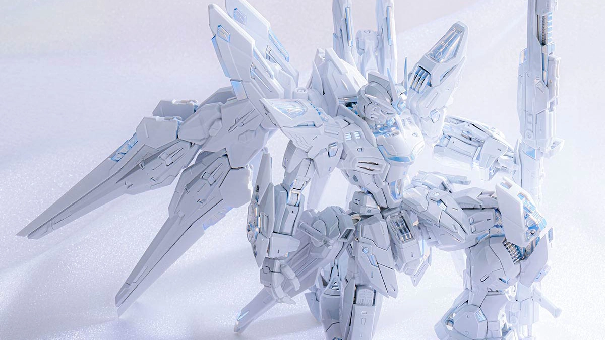 The entire mobile suit is finished in a pure, pearlescent white, with pale blue accents used for the highlighting colors.