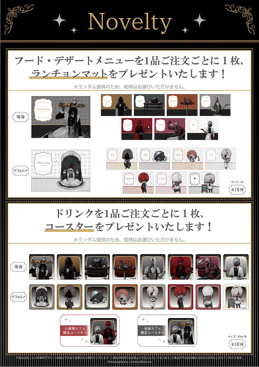 For every food item ordered customers will receive one character card (selected at random from 16 types) and for each drink item ordered, customers will receive 1 exclusive coaster (selected at random from 18 types).
