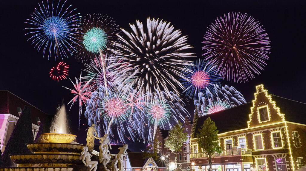 The fireworks will be visible around the park and the entirety of the European town destination will be illuminated during the New Year countdown with search light style illuminations.