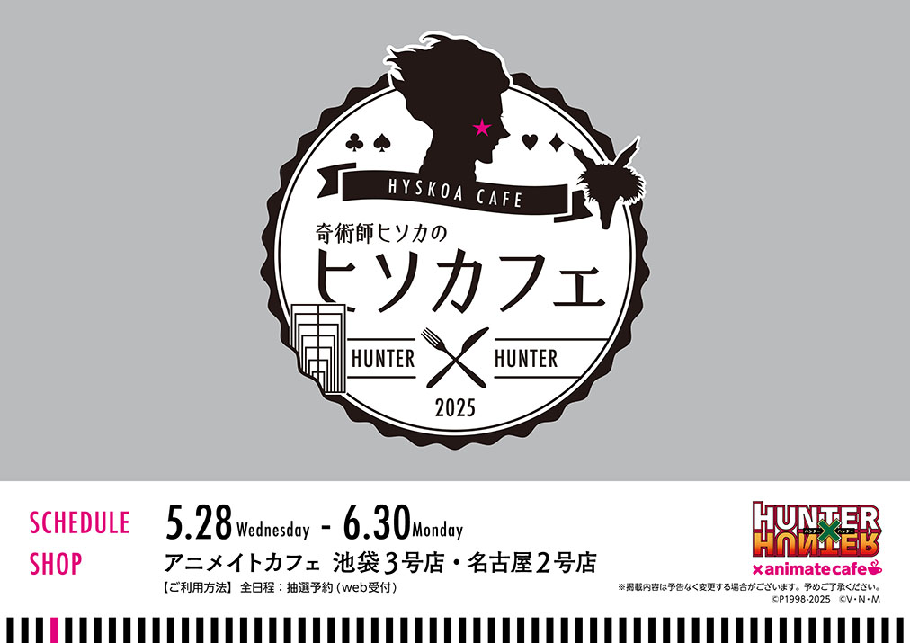 A new cafe for HUNTER × HUNTER with the theme of ‘Hisoka’s Cafe’ will open at Animate cafe locations in Tokyo and Nagoya from the 28th May.