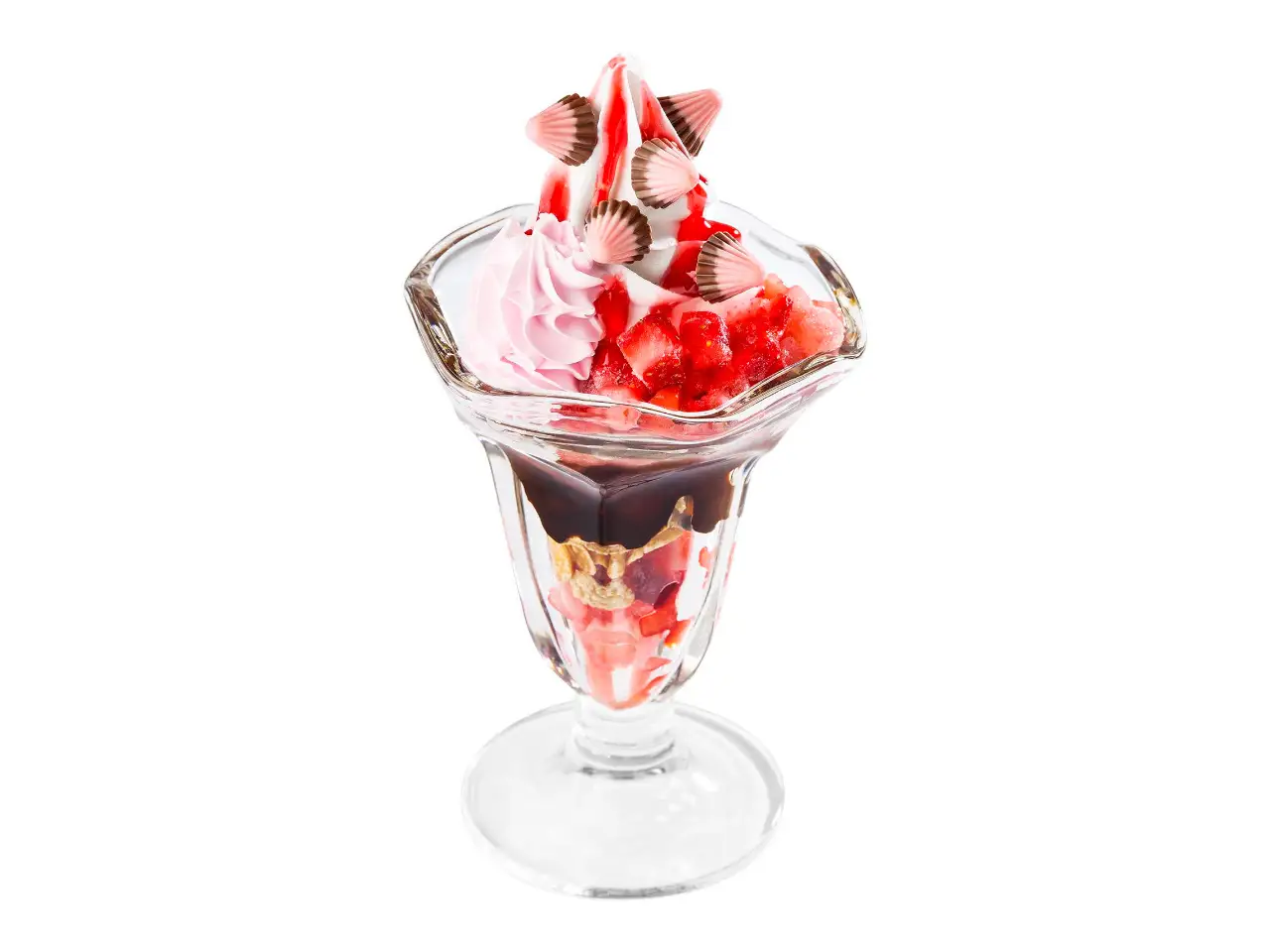 This indulgent product is abundant in strawberries, with layers of refreshing frozen strawberries, fragrant strawberry whipped cream, and rich soft serve ice cream.