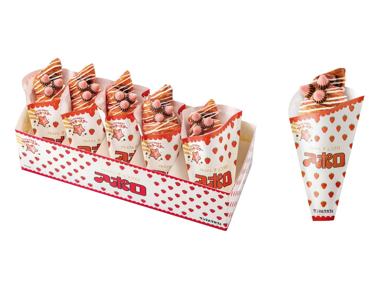 The “Premium Chococro Apollo” is a premium chocolate croissant crafted with a strawberry-scented pink croissant dough, chocolate, sweet and sour strawberry cream, and two Apollo pieces incorporated into its design, providing a crispy texture and the quintessential “Apollo” taste.
