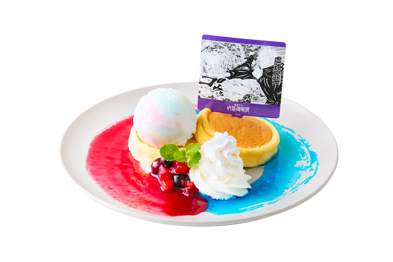 The pancakes are topped with marbled ice cream, whipped cream, and mixed berries. It is served atop blue and red sauces representing some of Gojo’s techniques.