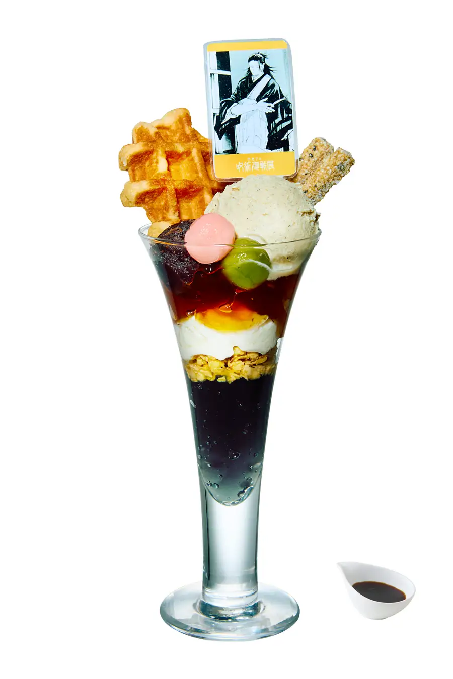 The Japanese-style parfait includes soy milk pudding, roasted green tea jelly, a waffle with a lattice pattern resembling Geto’s robes, bean paste balls and lemon-flavored black jelly.