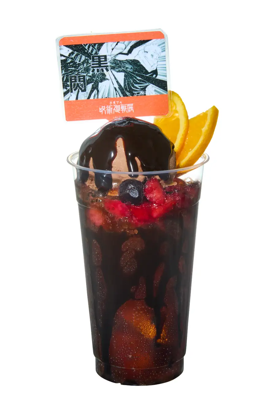 A cola-based beverage incorporating chocolate sauce and ice cream to represent Yuji Itadori’s powerful “Black Flash” attack, a technique that distorts space with a surge of black cursed energy.