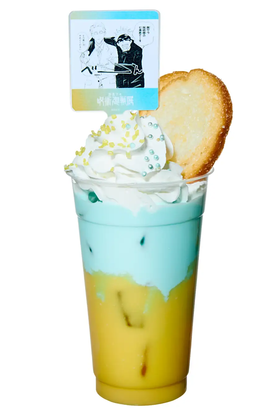 The drink features a combination of mango yogurt representing Nanami and blue curaçao milk representing Gojo, mixed in a “7:3” ratio, and topped with a rusk that combines Gojo’s fondness for sweets and Nanami’s preference for bread.