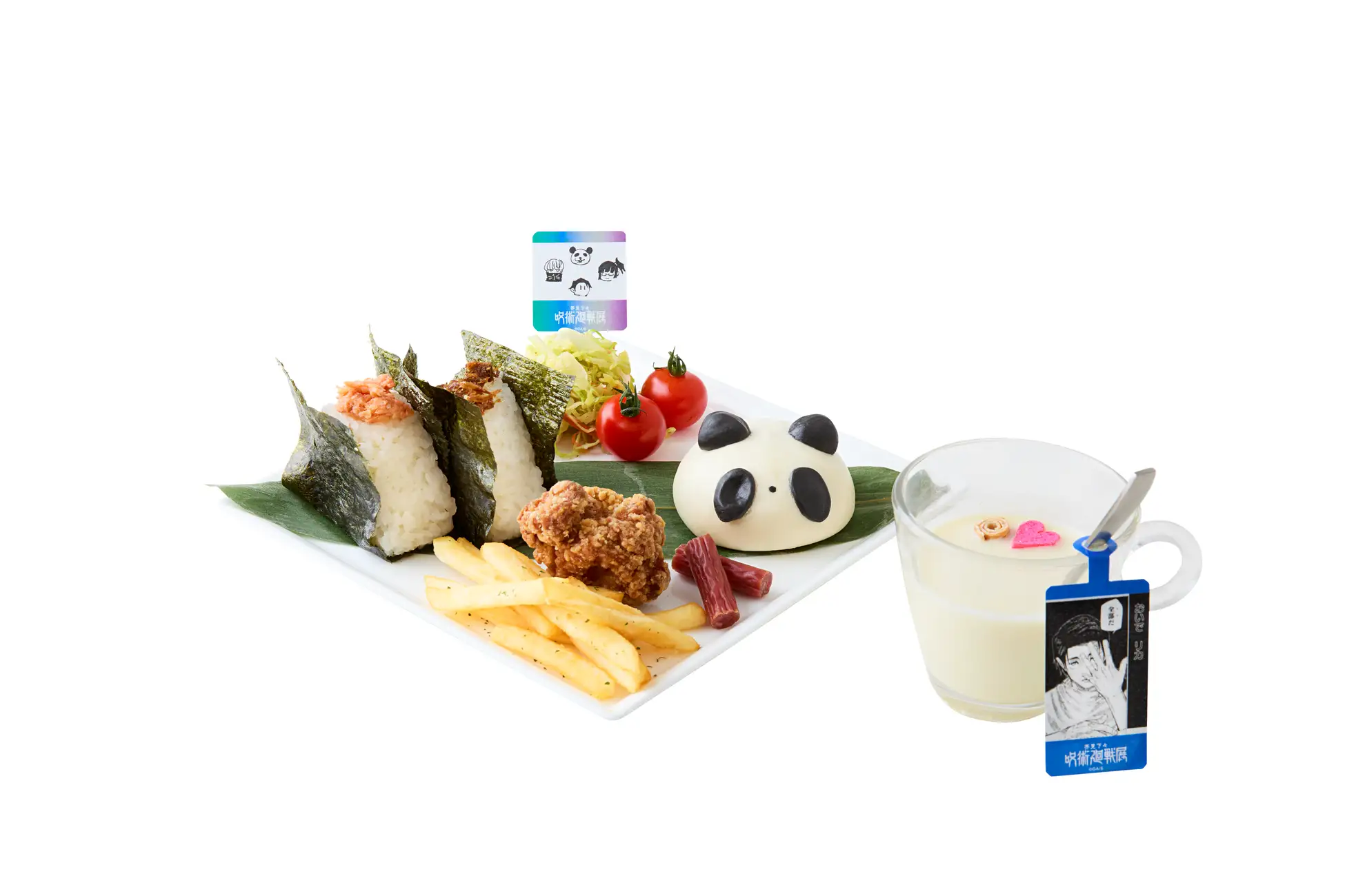The plate includes a panda-shaped bean-jam bun, calpas (dried sausage), Zenin Maki’s preferred fried chicken and potatoes, Inumaki Toge’s salmon and bonito flake rice balls, and a salted cabbage salad with sesame oil representing Okkotsu Yuta.