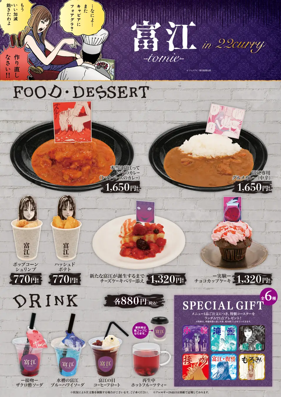 A total of 9 food and drink items will be available for fans of the acclaimed horror manga to sample.
