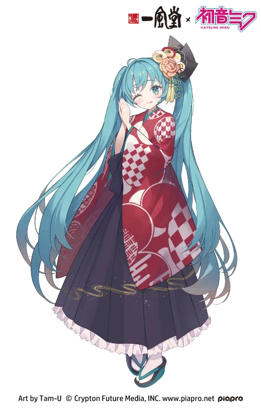 The main visual, illustrated by Tam-U, features Hatsune Miku in two different outfits: a traditional, ramen-themed kimono and an Ippudo staff uniform.