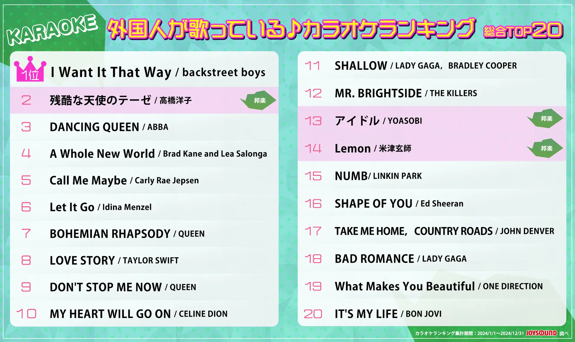 Ranking data was collected between January 1st, 2024 – December 31st, 2024 at JOYSOUND managed karaoke stores across Japan.