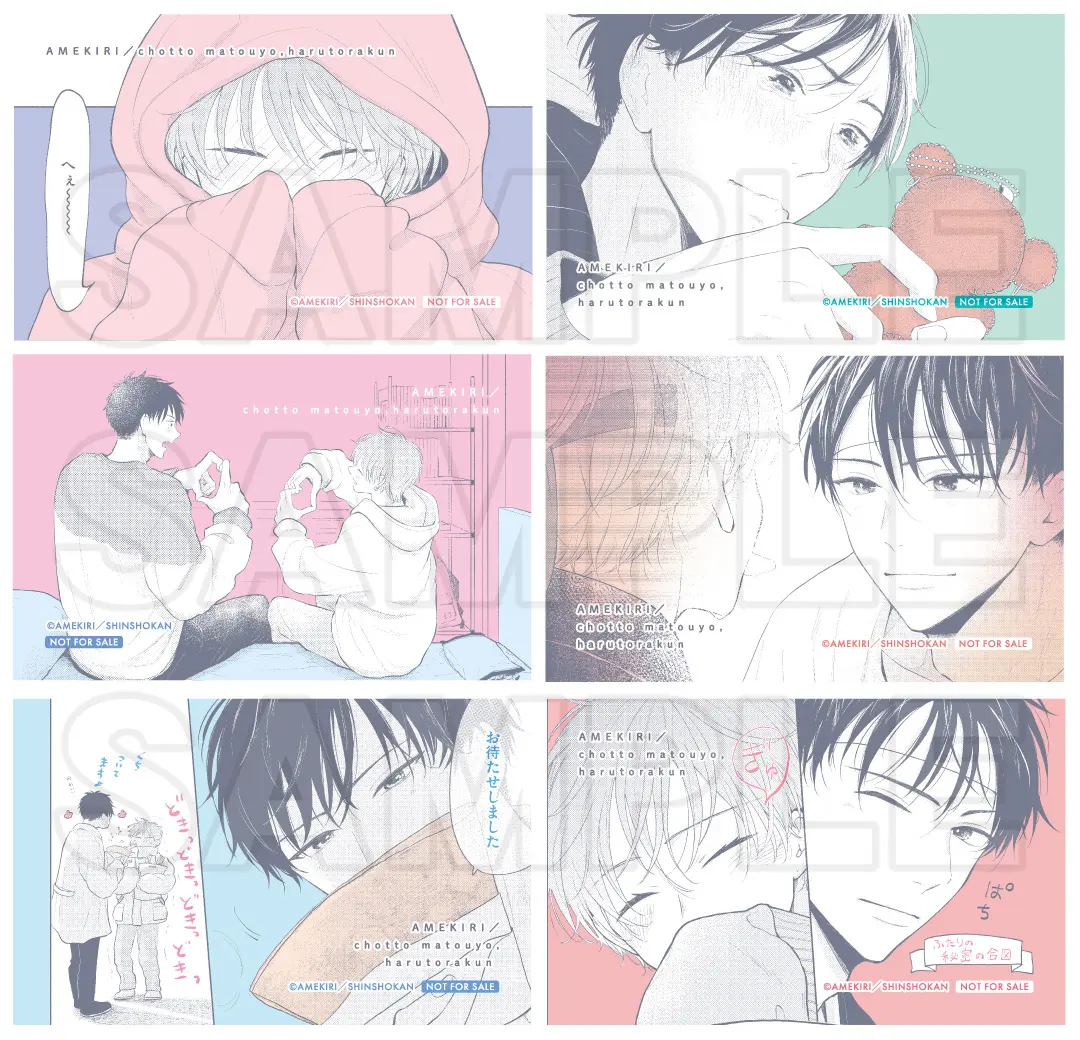 For every 1,100 yen spent on in stock or pre-order items for ‘Wait a Minute, Harutora-kun’ at the pop up shop customers will receive one exclusive business card-sized scene card (selected at random from 6 types).