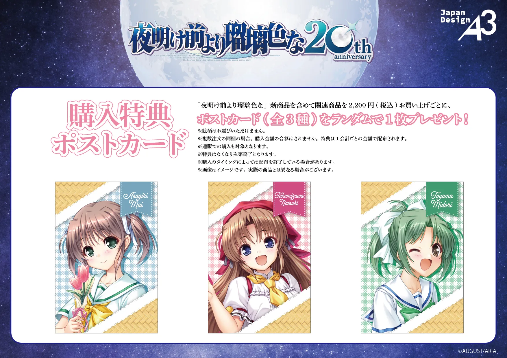 Customers who spend over 2,200 yen will receive one of 3 exclusive postcards at random.